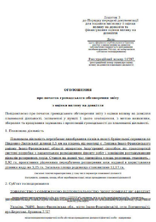 На електронну адресу Рогатинської міської ради надійшло Повідомлення, що 05.03.2026 у Єдиному реєстрі з оцінки впливу на довкілля оприлюднено оголошення про початок громадського обговорення звіту з оцінки впливу на довкілля щодо планованої діяльності ТОВ «КОНГЛОМЕРАТ ІФ» «Видобування пісків в якості будівельної сировини на Південно-Липівській ділянці 0,5 км на південь від околиці с. Липівка Івано-Франківського району Івано-Франківської області».