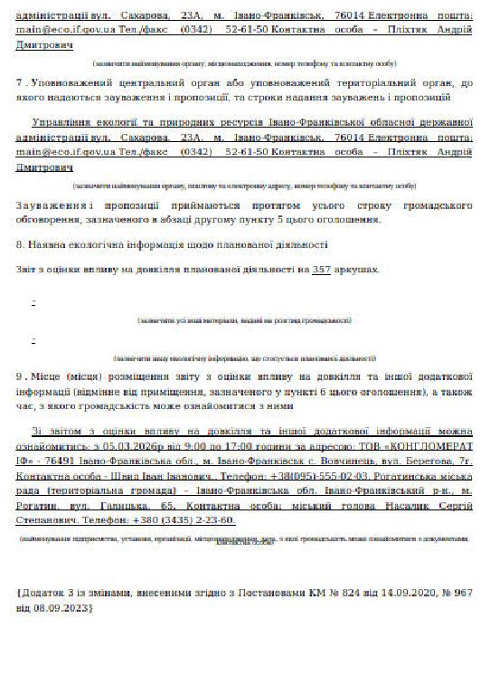 На електронну адресу Рогатинської міської ради надійшло Повідомлення, що 05.03.2026 у Єдиному реєстрі з оцінки впливу на довкілля оприлюднено оголошення про початок громадського обговорення звіту з оцінки впливу на довкілля щодо планованої діяльності ТОВ «КОНГЛОМЕРАТ ІФ» «Видобування пісків в якості будівельної сировини на Південно-Липівській ділянці 0,5 км на південь від околиці с. Липівка Івано-Франківського району Івано-Франківської області».